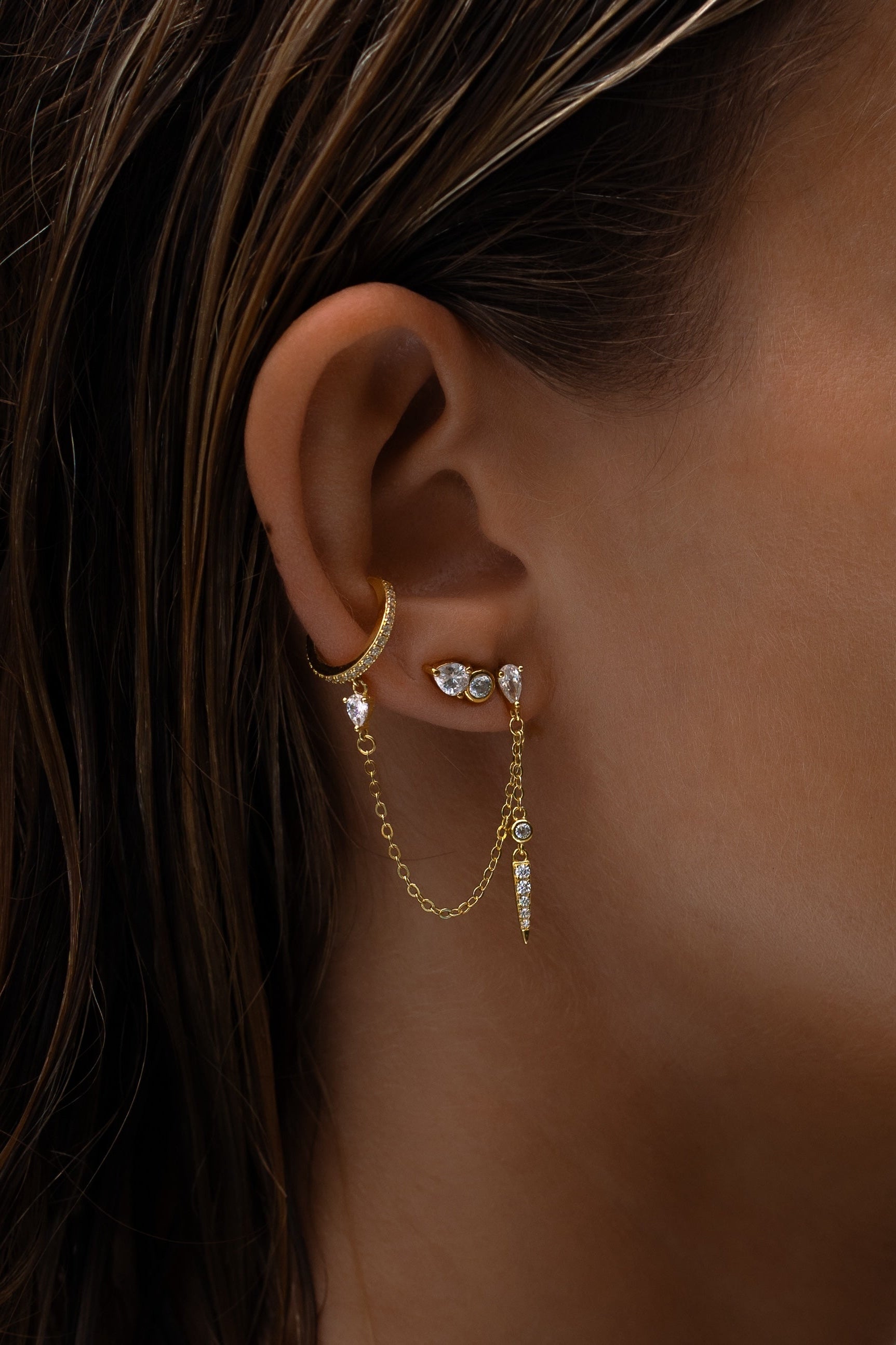 Our signature Illusion Earrings give the look of multiple piercings with just one. Cleverly designed with cascading chains and sparkling studs, they create a layered, curated ear without the commitment. It’s all the drama—none of the downtime.