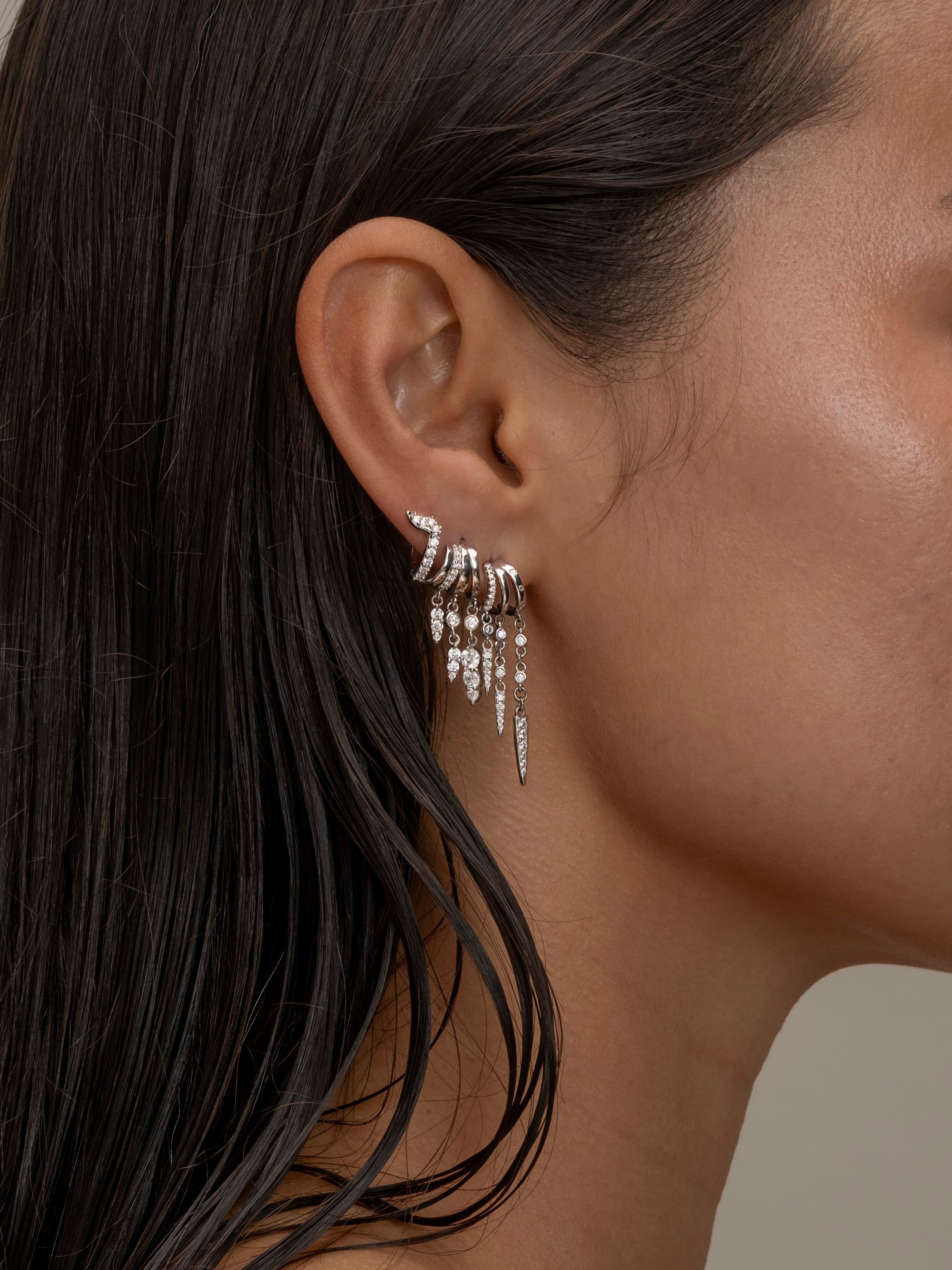 The Cleo is our first ever illusion huggie, crafted to give the look of four piercings with just one. Three rows of sparkling cubic zirconia charms cascade elegantly, catching the light with every movement.