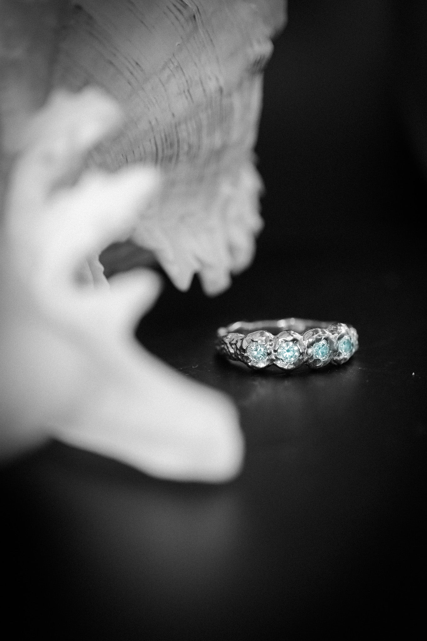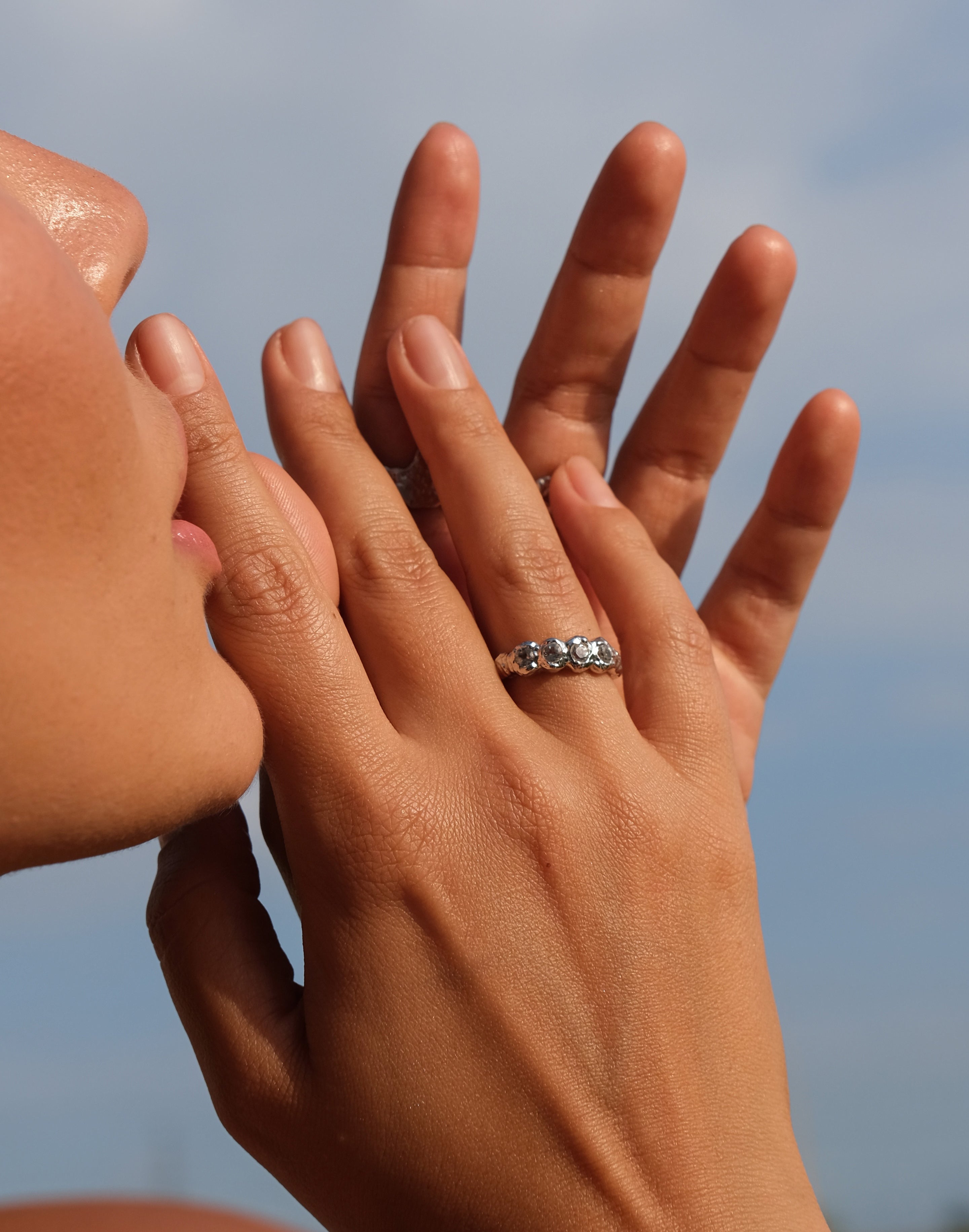 The Juno Ring is inspired by the Roman goddess Juno - known for her strength, protection, and beauty. Available in both sterling silver and 14k gold vermeil, its molten, organic texture gives it a raw, sculptural feel. Four white or light blue topaz stones are set like stars, adding soft sparkle that contrasts beautifully with the rugged metal. A piece that balances power and grace - just like its namesake.