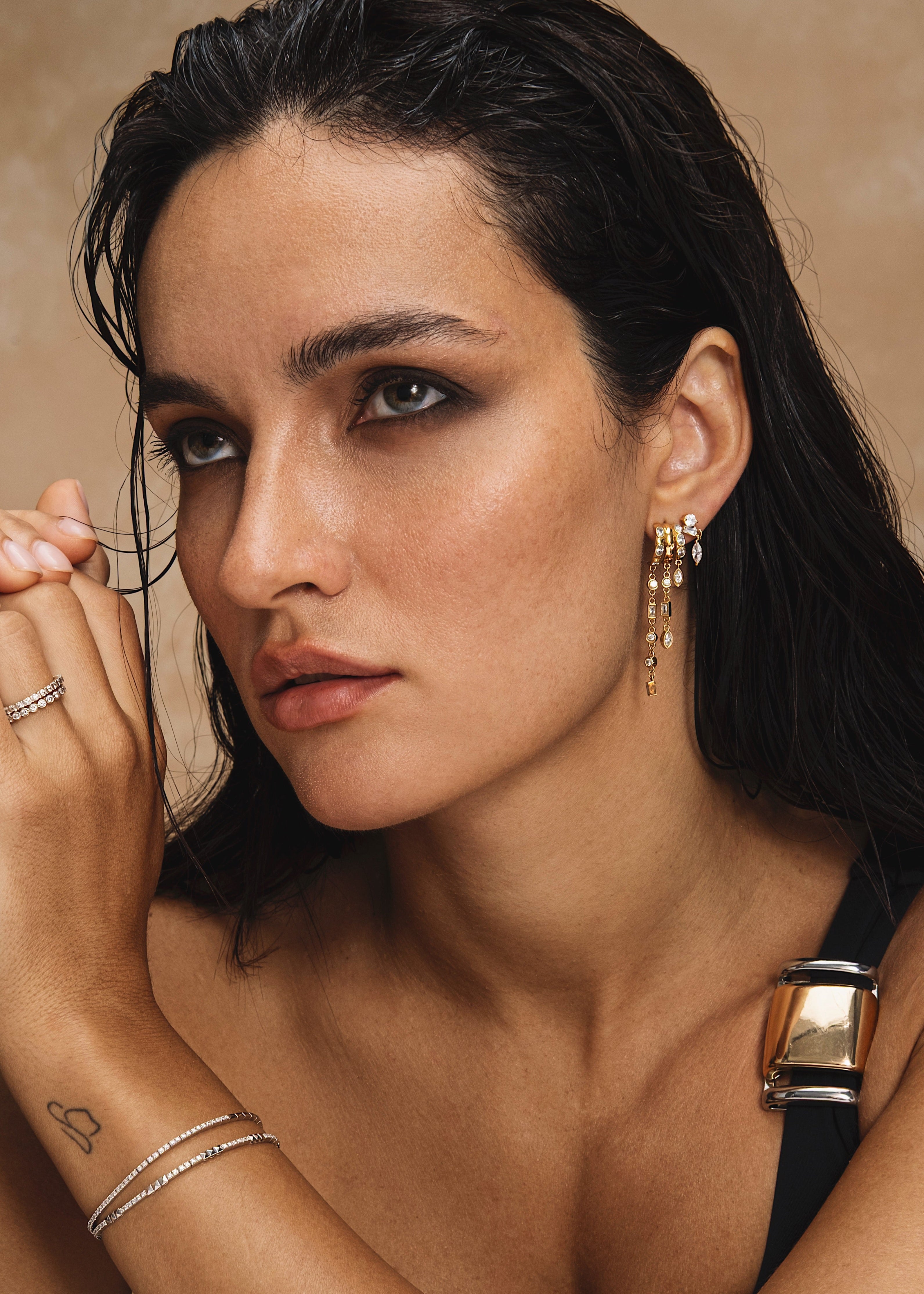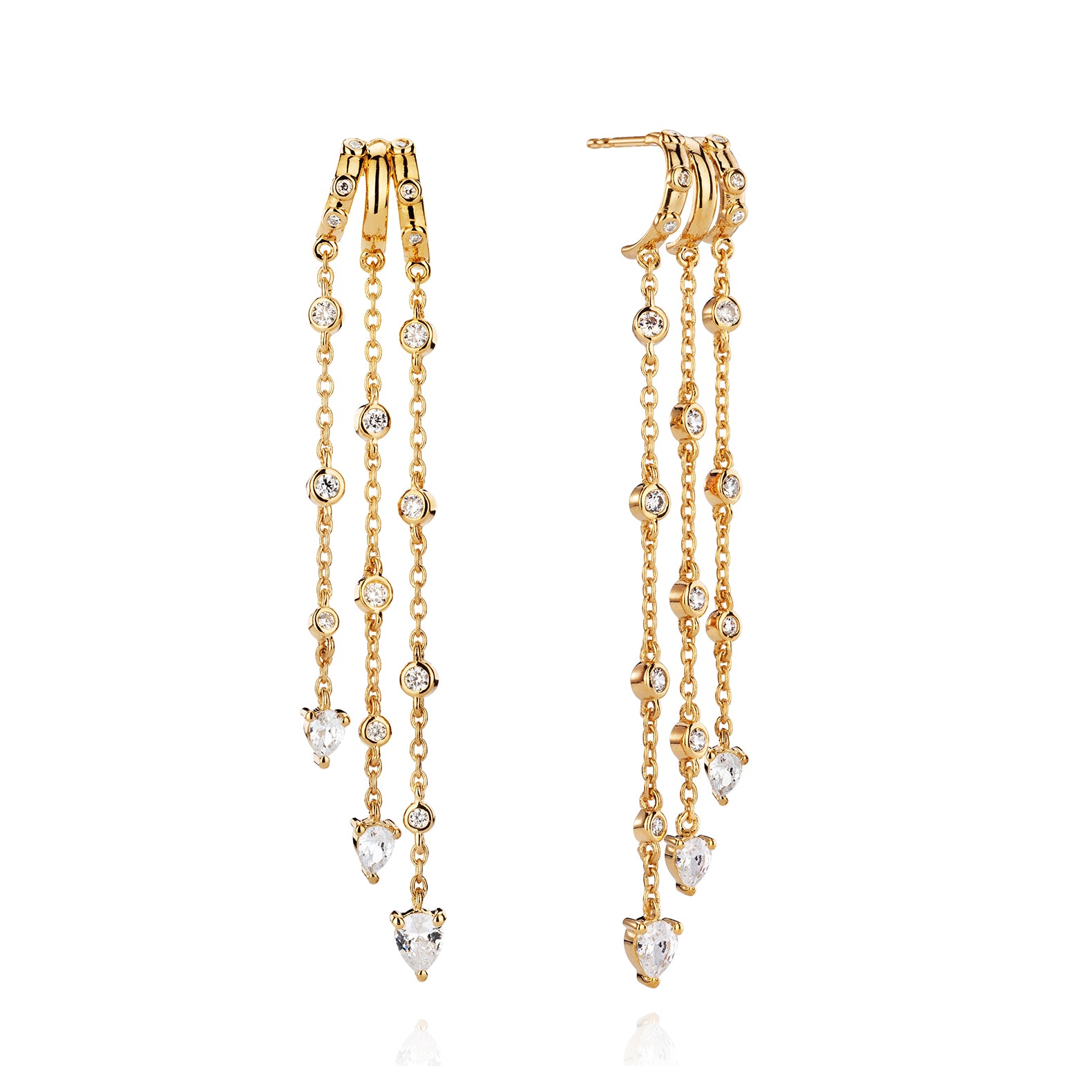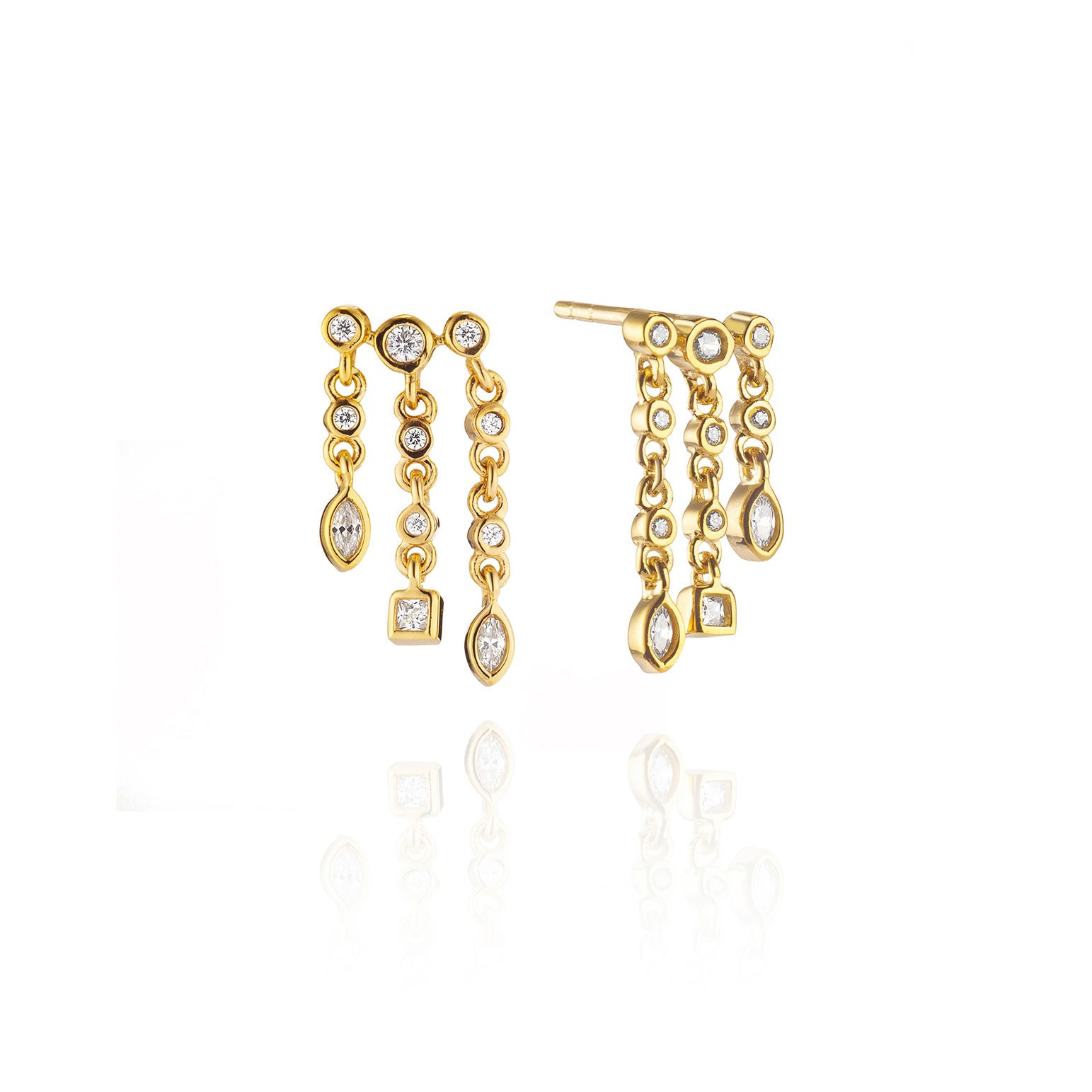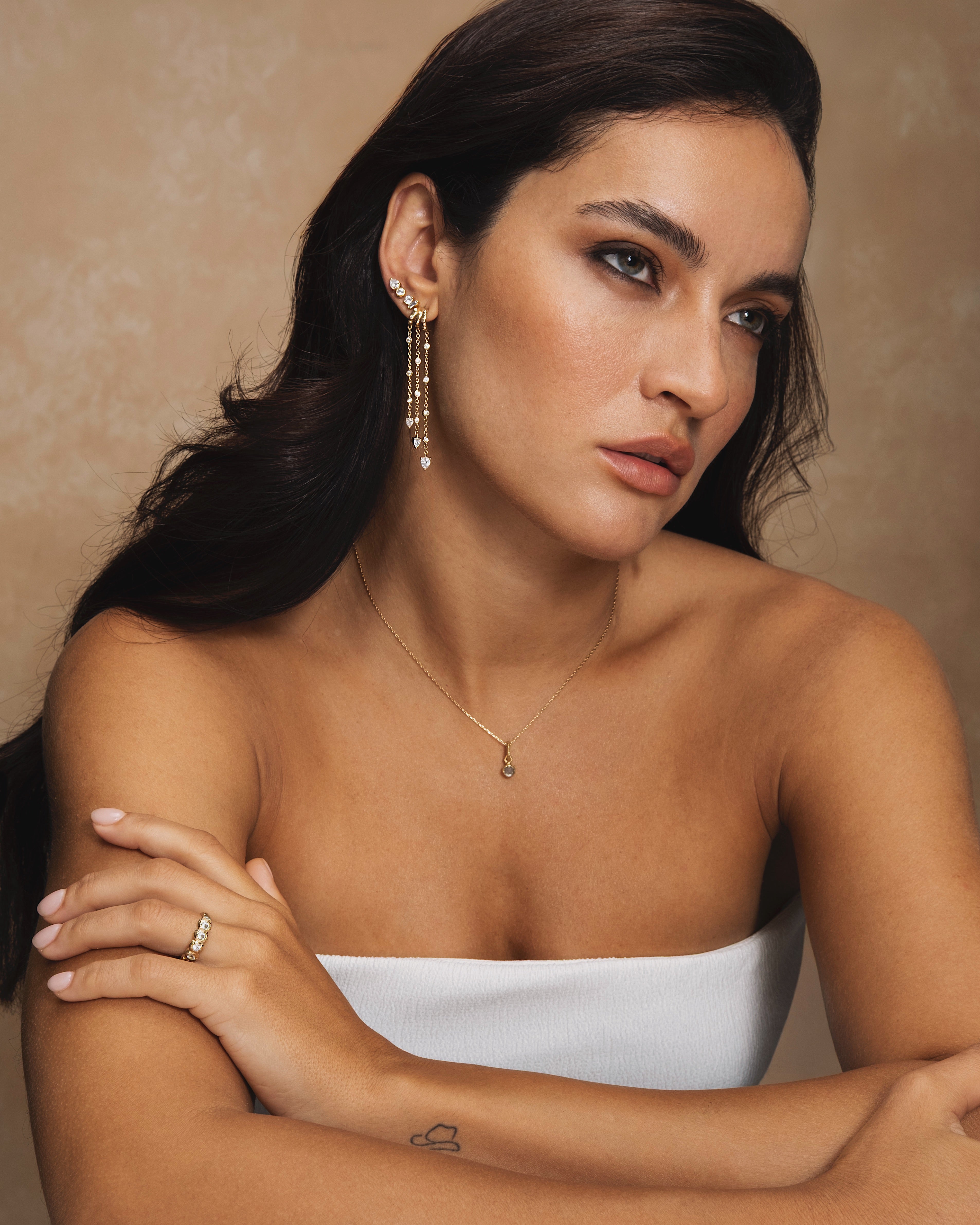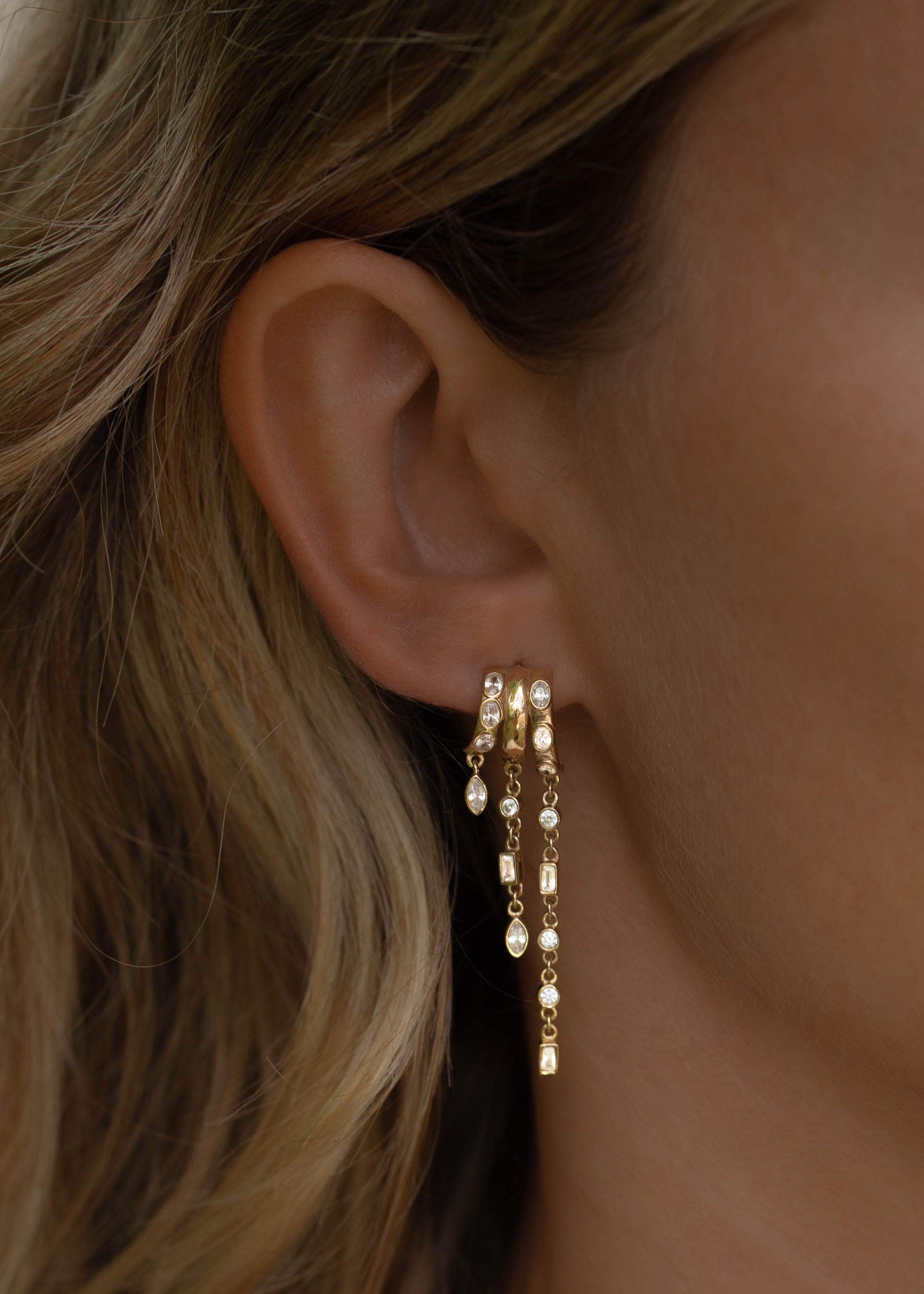 Our signature Illusion Earrings give the look of multiple piercings with just one. Cleverly designed with cascading chains and sparkling studs, they create a layered, curated ear without the commitment. It’s all the drama—none of the downtime.