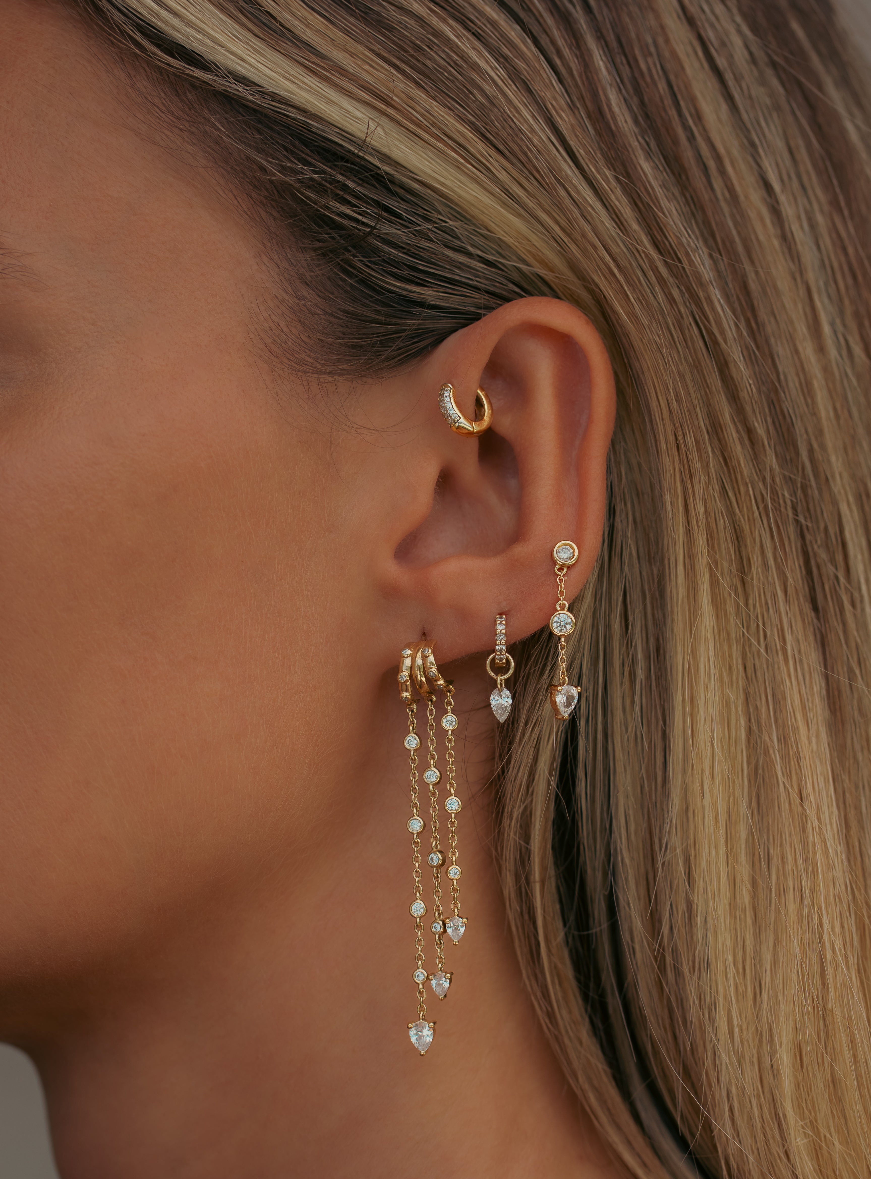 Our longest illusion design yet, the Alta Earrings bring show-stopping sparkle to any occasion. This statement earrings feature three cascading crystal-studded chains creating the look of multiple piercings from just one, moving beautifully with every step.