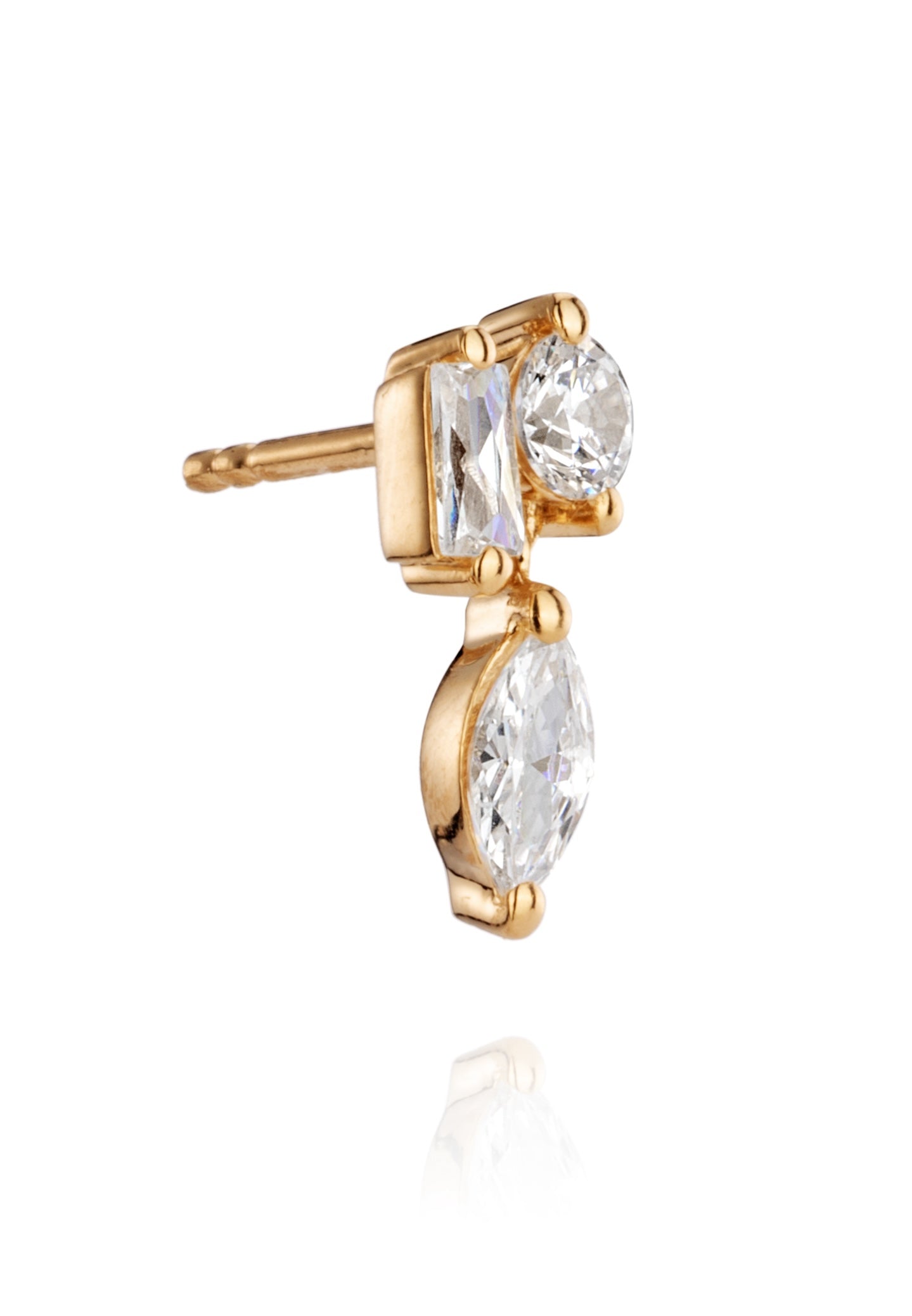 The Isola Stud is a small but striking piece designed to add instant sparkle to any stack. Featuring a trio of mixed-cut stones - a round, a baguette, and a marquise - the arrangement creates a delicate drop effect with subtle movement.