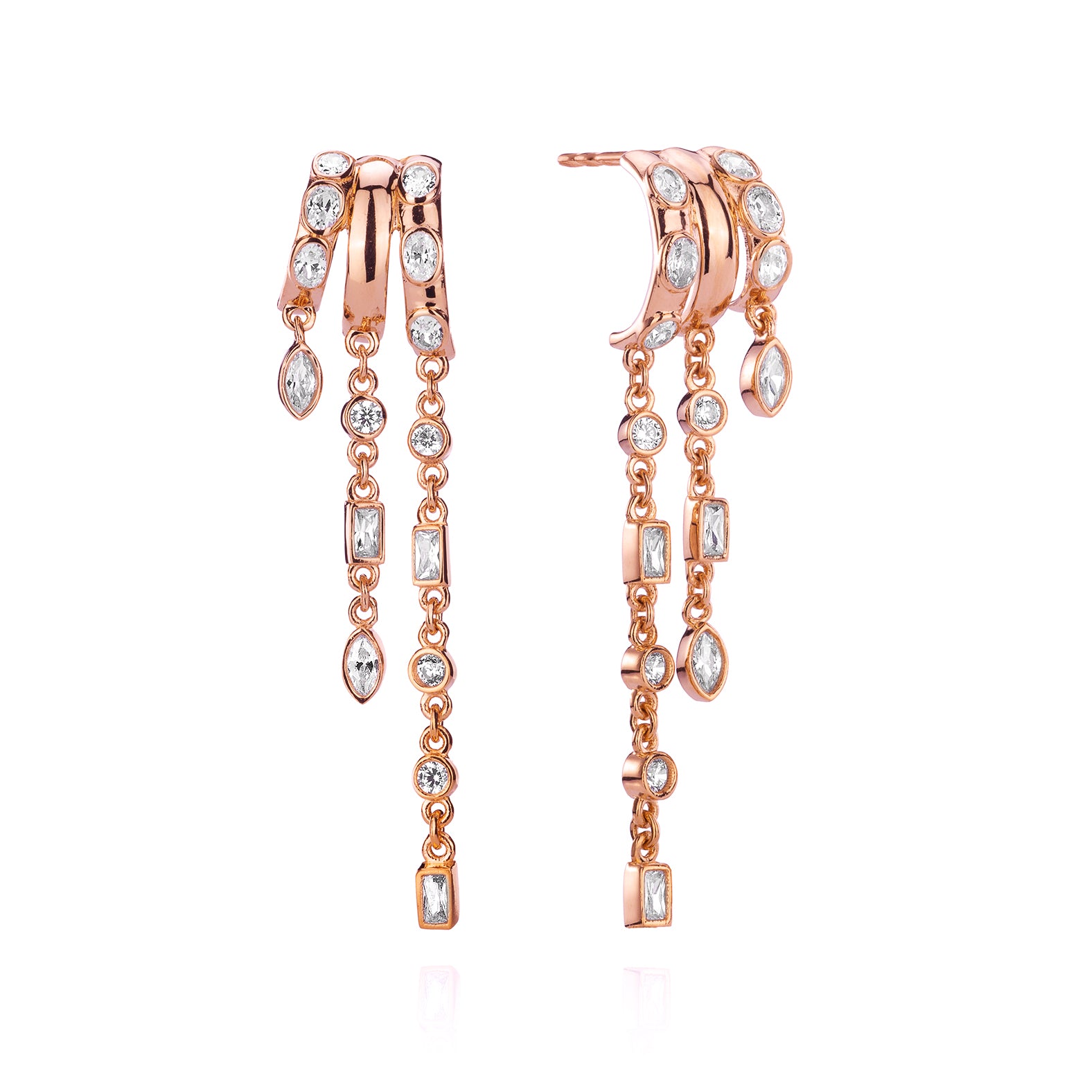 Meet Kalani - our chunkiest and boldest Illusion earring yet. With its dramatic length and wide, triple-chain design, this piece is made to stand out on its own. Crystal-studded rows in mixed shapes cascade from a single post, giving you the look of a fully stacked ear without the need for multiple piercings.