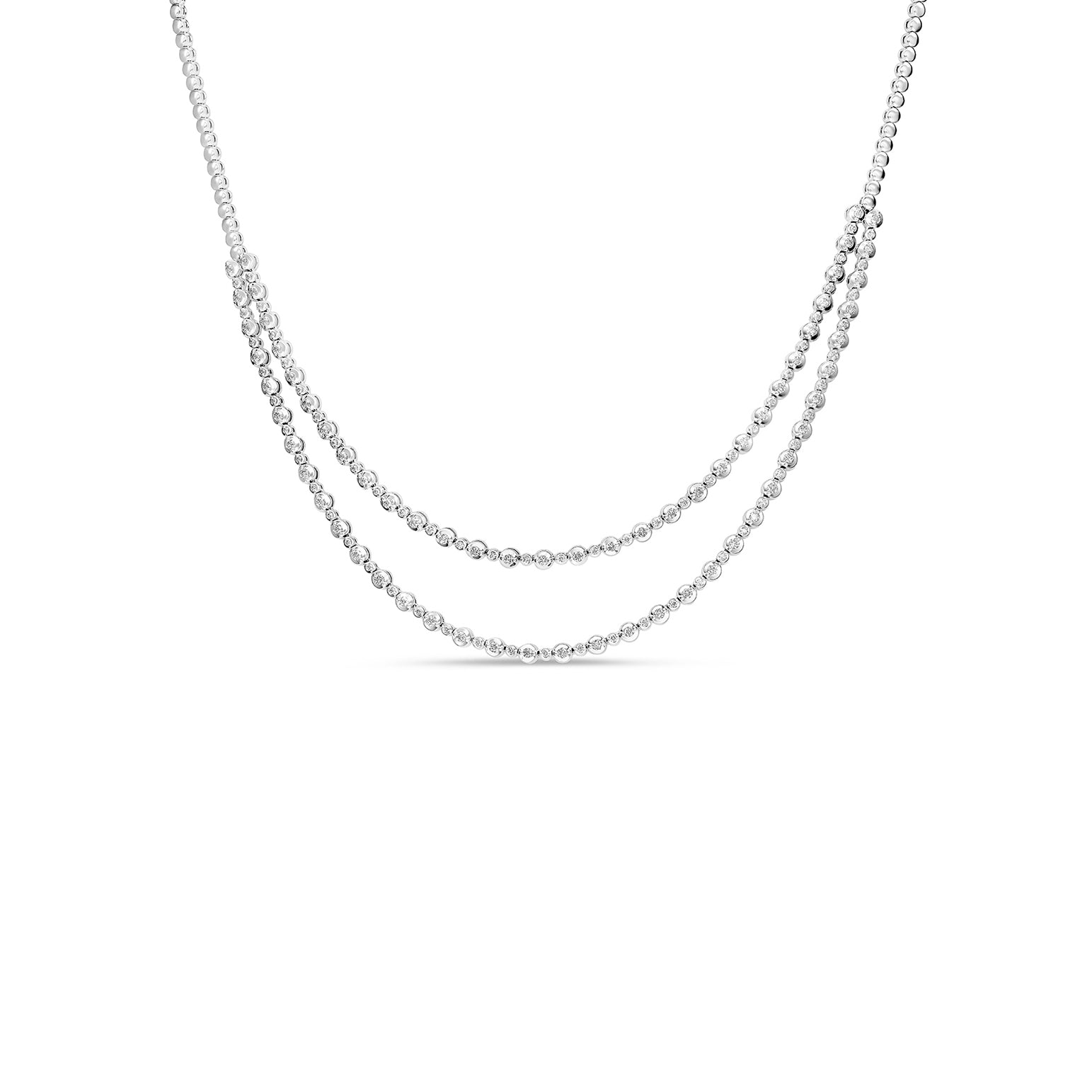 A layered twist on the tennis necklace, this style features two rows of bezel-set diamonds draped from a slim gold chain. The double strand gives extra movement and sparkle, making it an effortless statement piece you can wear with anything.