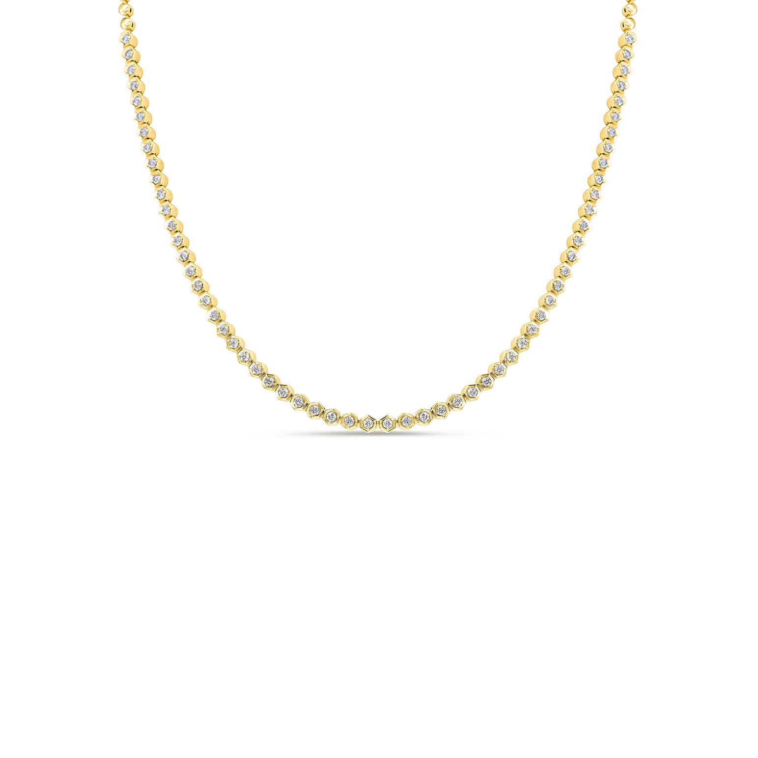 A sharper take on the classic tennis, this necklace sets round diamonds in hexagon links across the front, adding extra shine along the neckline.