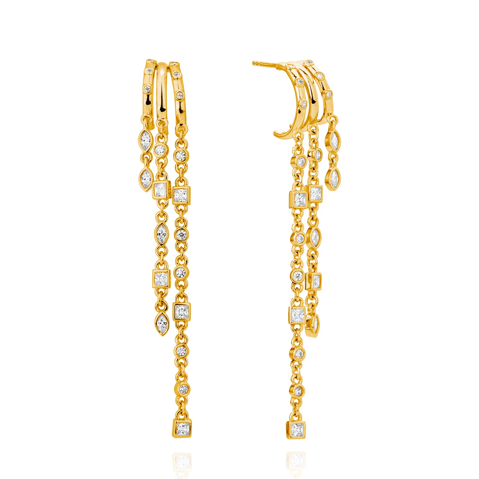 Our signature Illusion Earrings give the look of multiple piercings with just one. Cleverly designed with cascading chains and sparkling studs, they create a layered, curated ear without the commitment. It’s all the drama—none of the downtime.