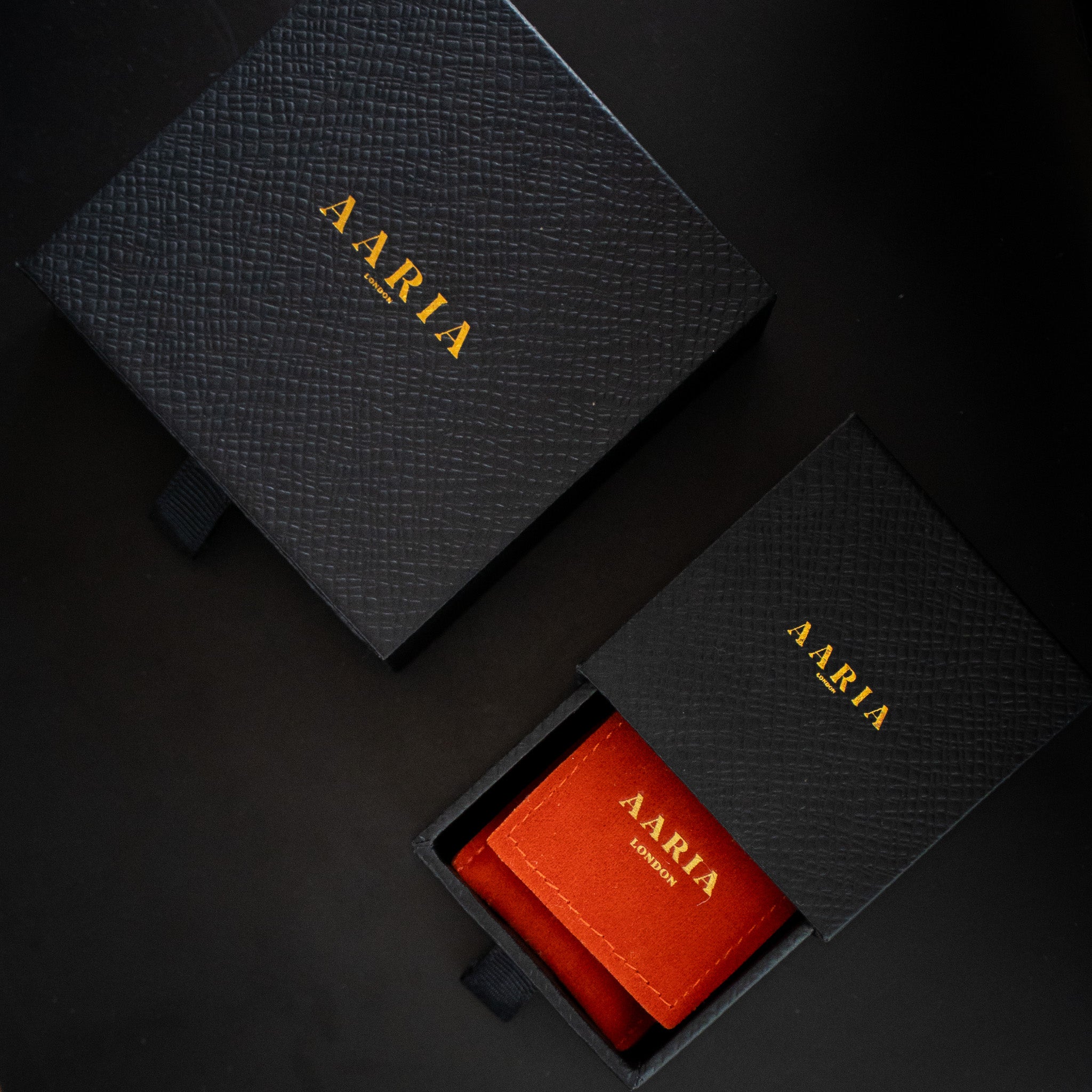 Your order will arrive in a small Aaria London keepsake box and velvet pouch. All packaging is recyclable and we are proudly plastic free.