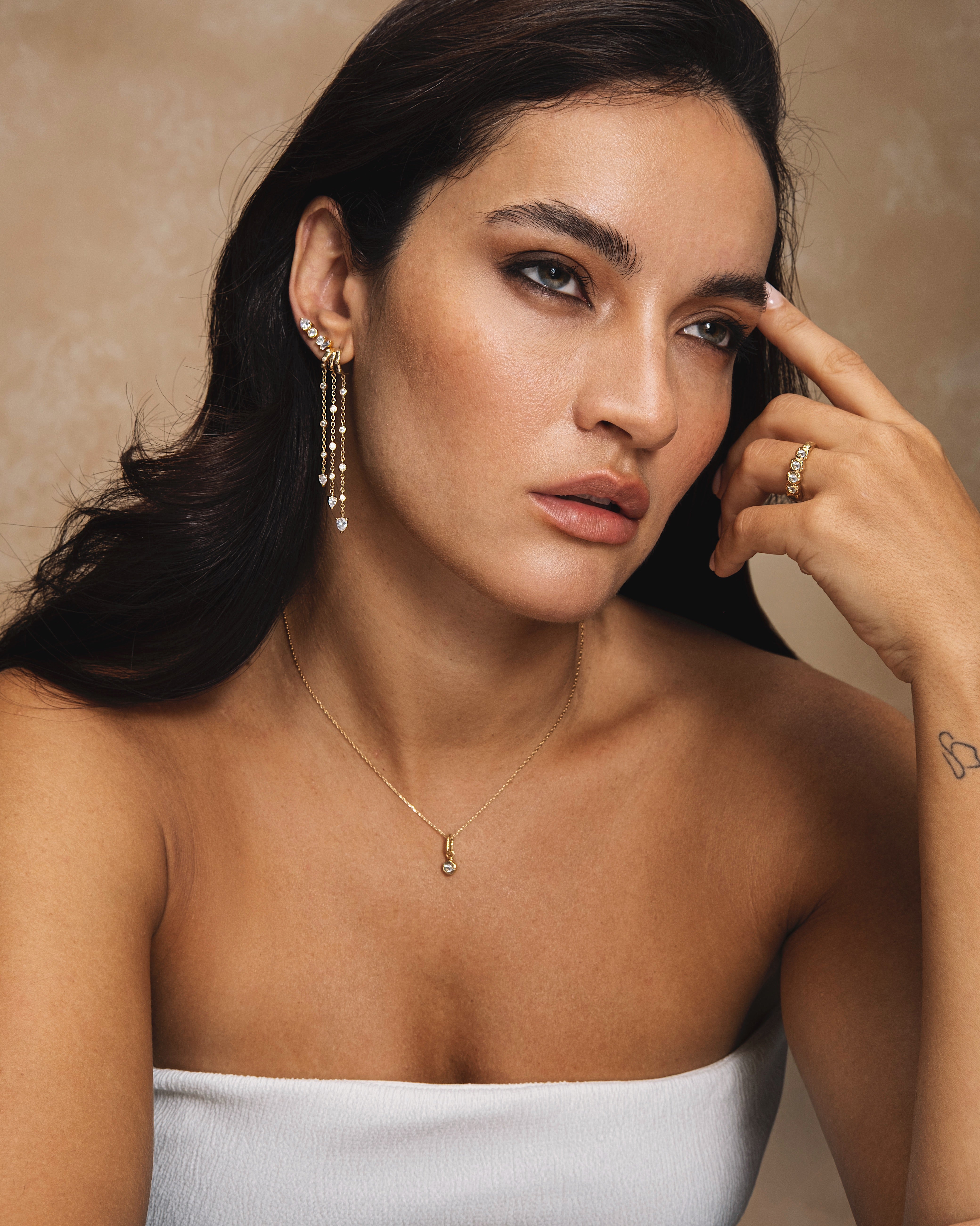 Our signature Illusion Earrings give the look of multiple piercings with just one. Cleverly designed with cascading chains and sparkling studs, they create a layered, curated ear without the commitment. It’s all the drama—none of the downtime.