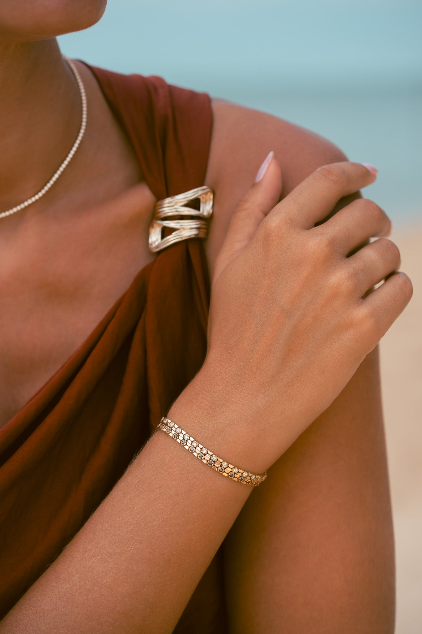Here, the honeycomb links hold black diamonds instead of white, so the line around the wrist looks sharper and more graphic. The dark stones give it a cooler, moodier feel - ideal if you want something a bit tougher than a traditional diamond tennis.